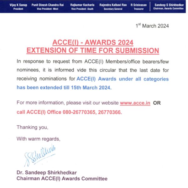 We invite nominations for the various ACCE(I) Awards as listed under Annexure 1 , hosted on our website: www.acce.in